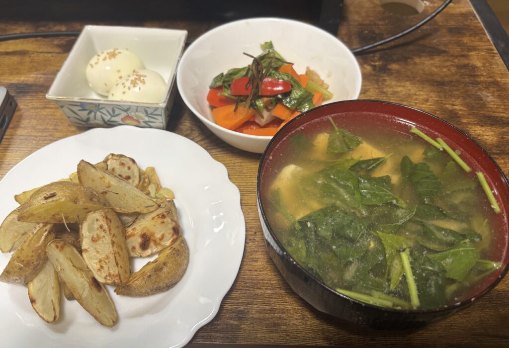なるべく栄養が偏らないようにタンパク質、糖質、ビタミンを意識して食事を摂っています。